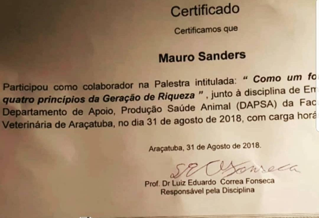 Certificado de palestrante parceiro ao fomento do empreendedorismo para os alunos da UNESP.